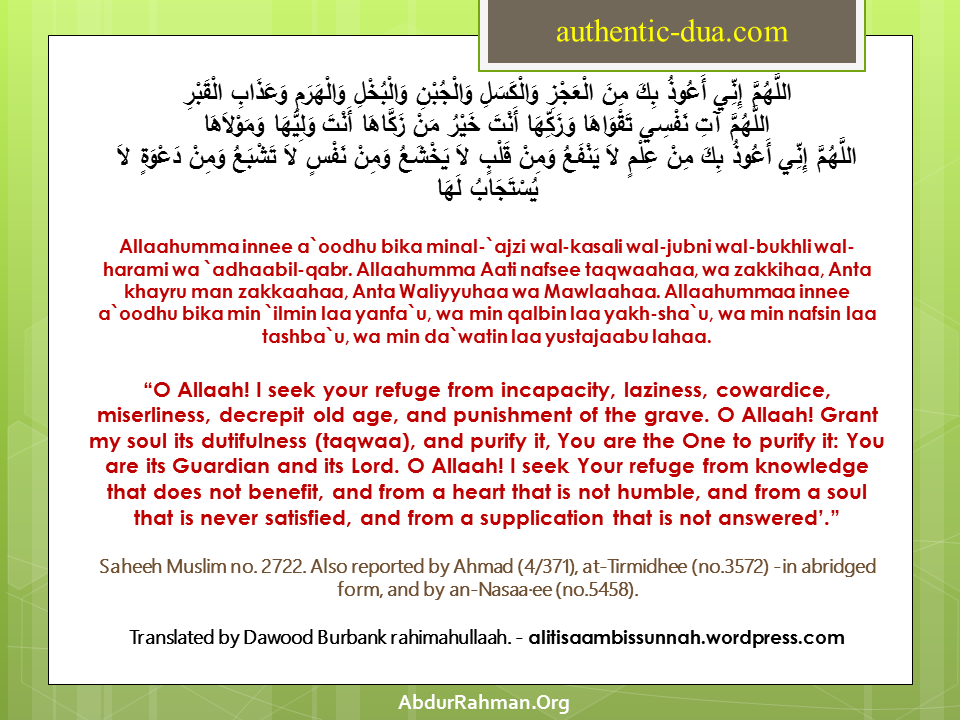 Allaahumma innee a`oodhu bika minal-`ajzi wal-kasali wal-jubni wal-bukhli wal-harami wa `adhaabil-qabr. Allaahumma Aati nafsee taqwaahaa, wa zakkihaa, Anta khayru man zakkaahaa, Anta Waliyyuhaa wa Mawlaahaa. Allaahummaa innee a`oodhu bika min `ilmin laa yanfa`u, wa min qalbin laa yakh-sha`u, wa min nafsin laa tashba`u, wa min da`watin laa yustajaabu lahaa.