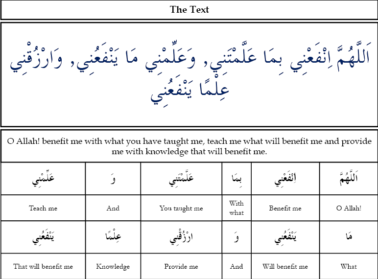 Oh Allaah, benefit me by that which you have taught me-arabic text